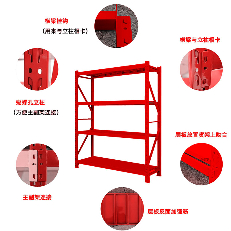貨架是拆裝式,層距可調(diào)節(jié),可加層可減層,貨架層板有加筋可增加承重